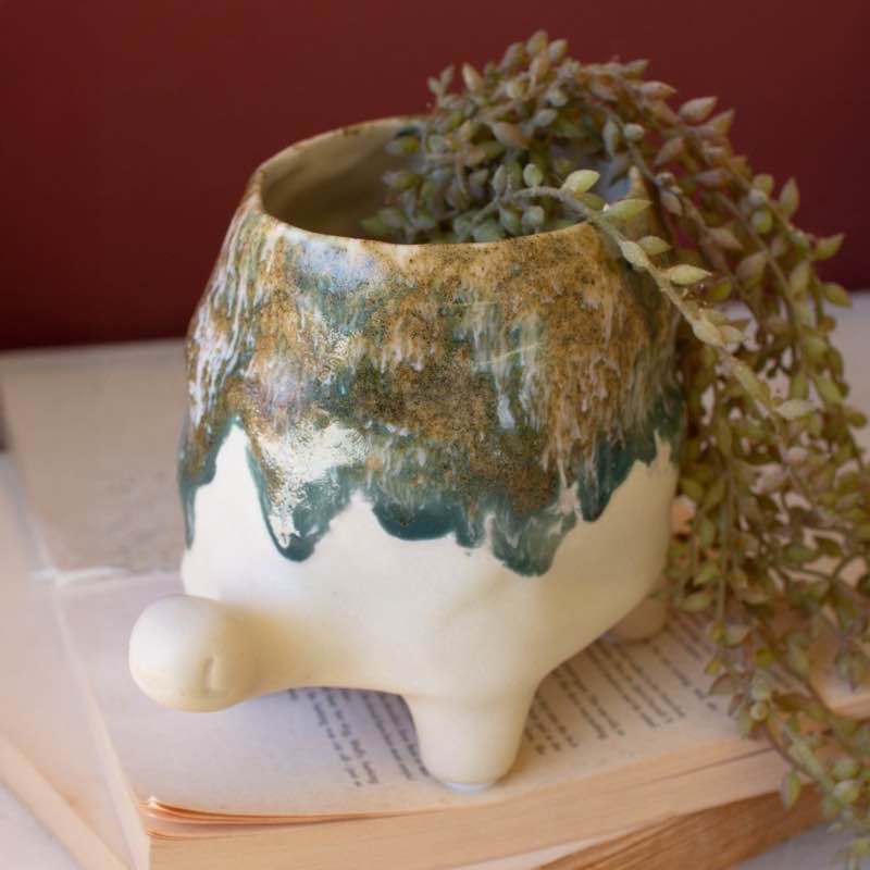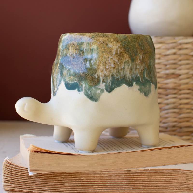 Slow and steady wins the race . This ceramic turtle vase has a color bleed in olive green with a natural base. Grab one for your garden area or succulent stash. Turtles in home decor symbolize longevity, stability, and tranquility, making them a meaningful and stylish addition to any space. These charming accents bring a touch of nature-inspired serenity to...read more