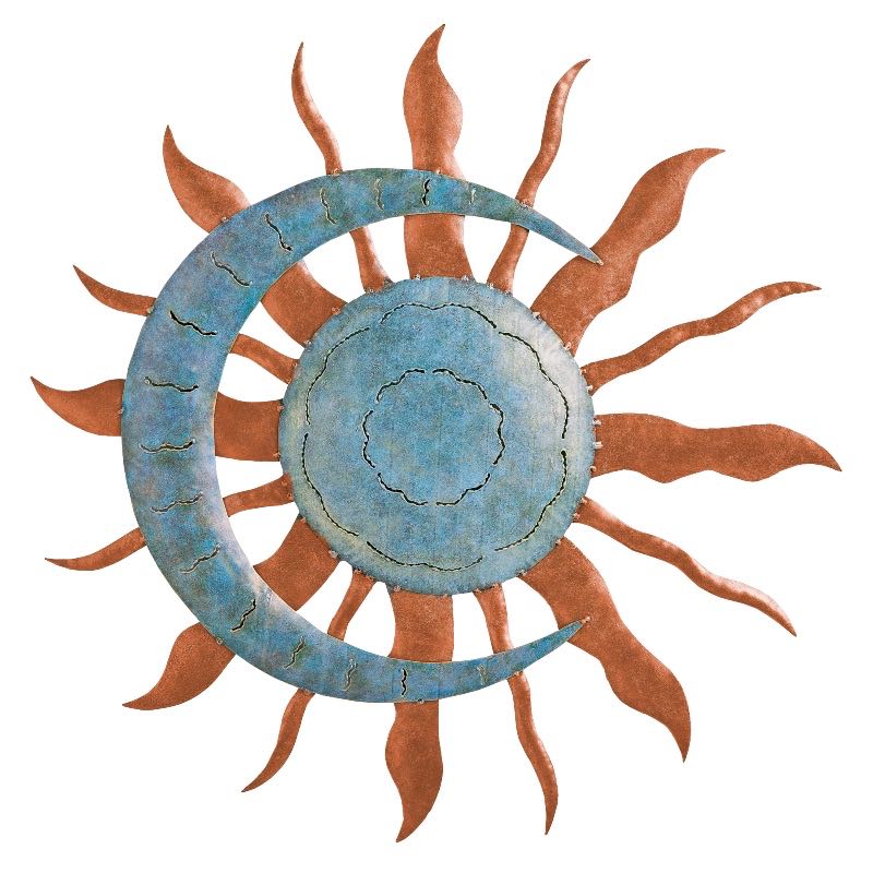 The pastel blue moon encircles the copper and verdigris sun for a spiritual piece that will enchant any indoor or outdoor space. Due to its durability, this weather-resistant wall hanging can stay outdoors all season long, so you can see the sun and moon even on cloudy nights.