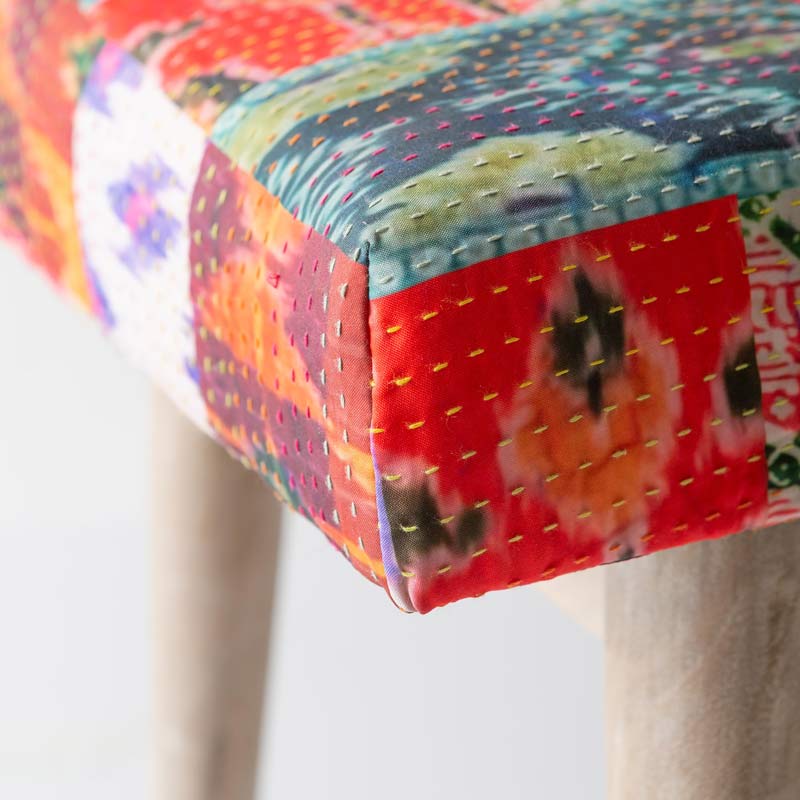 This bench, upholstered with Sari-style printed fabric and colorful Kantha hand stitching, stands out in an entry or at the foot of the bed. The light gray Indica wood tapered legs add a modern touch. Foam cushion, imported.