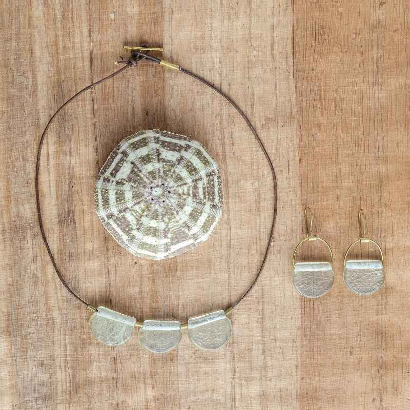 Recycled glass is pressed into half circle beads and paired with brass, for a distinctly oceanic feel. The Playa Glass Drop Brass Necklace is strung on an adjustable soft leather cord, 18" diameter. This design is part of the Playa collection of recycled glass-embellished jewelry that's crafted for the modern bohemian in each of us. Handcrafted in Indonesia by our artisan partners.