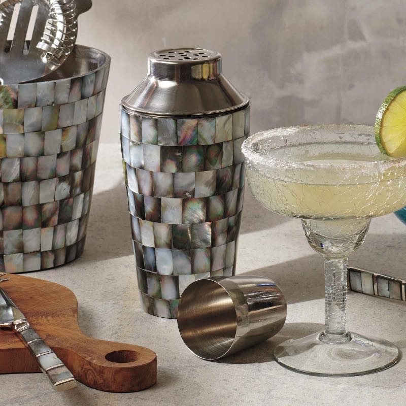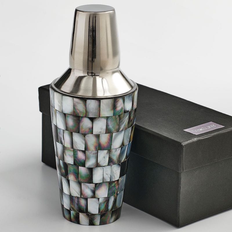 Artisans from India meticulously arrange squares of blue-gray mother of pearl to enhance the essential stainless steel components creating a shaker thats not only functional but visually stunning. This piece is not just for professional bartenders or mixology enthusiasts; its perfect for anyone seeking to elevate their drink-making experience. It comes elegantly packaged in a sleek black gift box.
