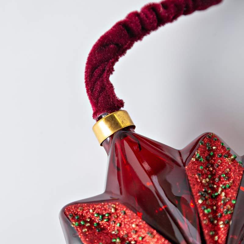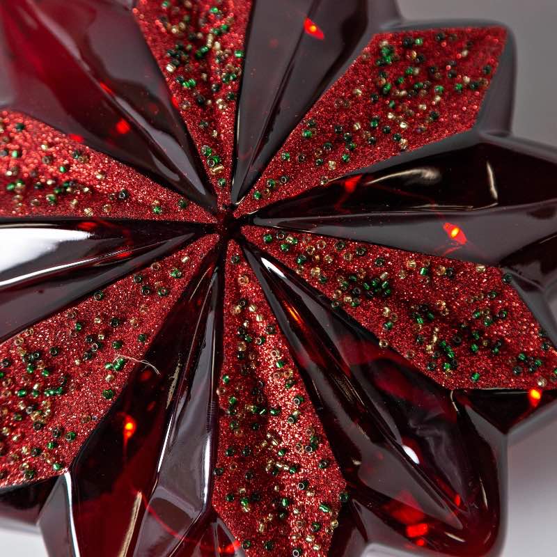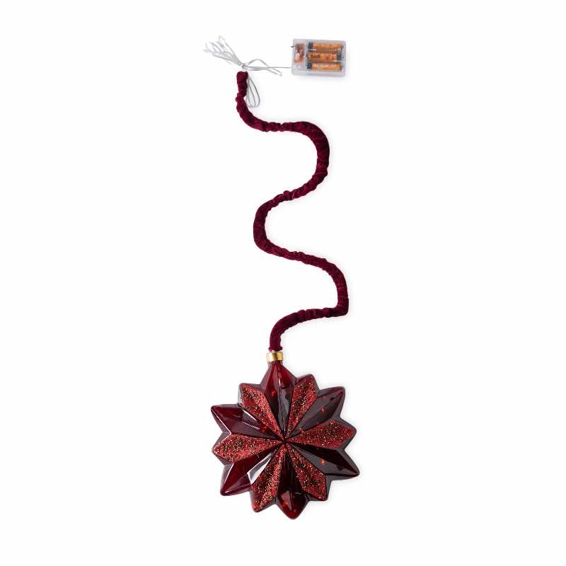 These illuminated glass star lights offer an inspiring holiday display for mantels, windows, and stairs. Each has a unique look with textures that become more visible when lit by the LED string lights within. Red sparkling beaded glass with velvet rope. 3 AA batteries (not included). 6-hour timer.