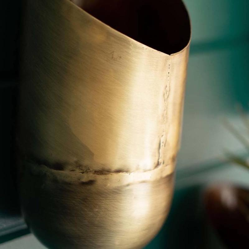 Perfect for succulents root plants or floral blooms our wall-mounted vases offers a creative way to display greenery. No green thumb? No problem! These wall vases look equally chic with the addition of a pillar candle or faux foliage. Arrives in a set of three sizes each planter is handcrafted by artisans in India who cut and bend the antique brass metal. Each has a hook on the back for easy placement.