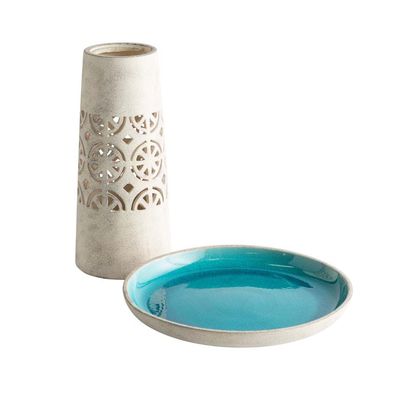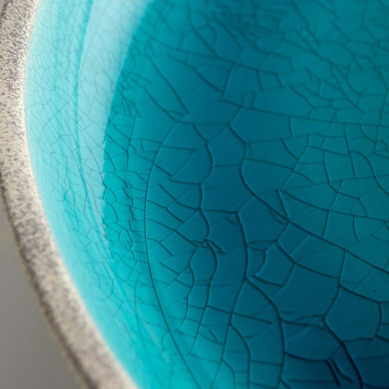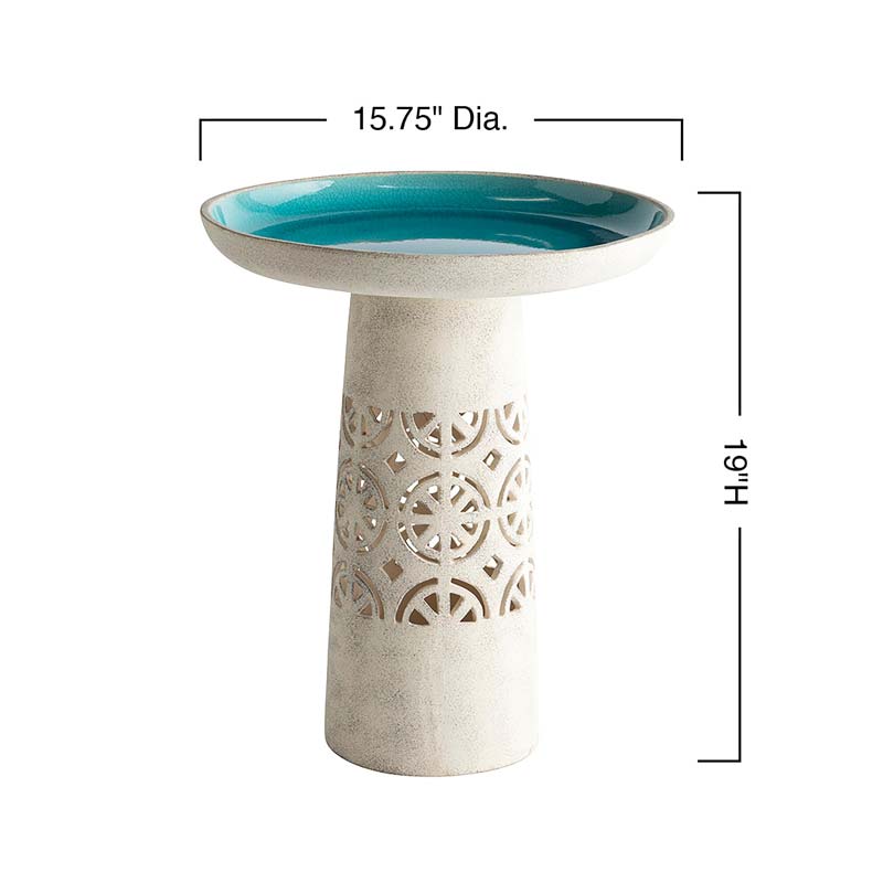Featuring a lock-on top and an aqua crackle-glazed interior, this birdbath is a lovely place for birds to cool off while adding a bit of geometric textural ambiance to your yard. The wide basin offers water for many of your feathered friends, and its 1.5" depth allows small birds to bathe easily. The wide rim offers perching spots for larger birds, and its texture finish lends a contemporary look.