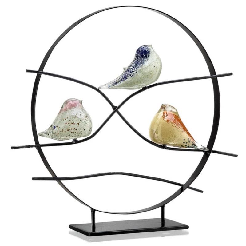 Created with opaque color and designed to display nature in a modern way this Art Glass Bird Trio Desk Decor makes a beautiful statement piece for any hallway living room or office space. Artisans hand blow the dappled colorful birds so each one is unique. Bring home natures bounty with a beautiful wildlife sculpture. Makes a perfect gift for a bird lover!