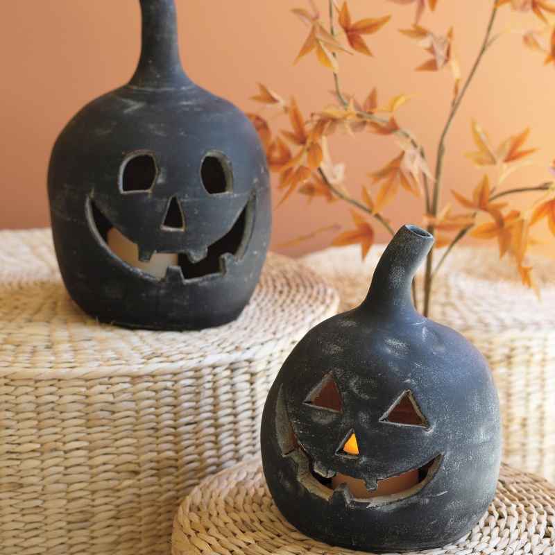 Artisan-made clay jack-o-lanterns are a unique and charming decorative item that adds a touch of whimsy and spooky delight to any space. This set of two lanterns is handcrafted with great attention to detail and made by artisans who specialize in working with clay.