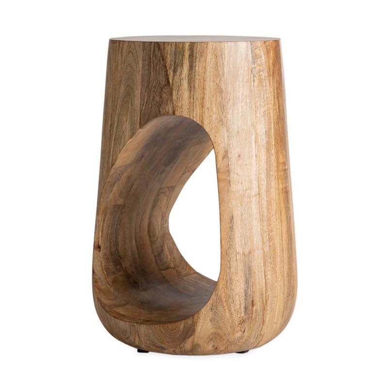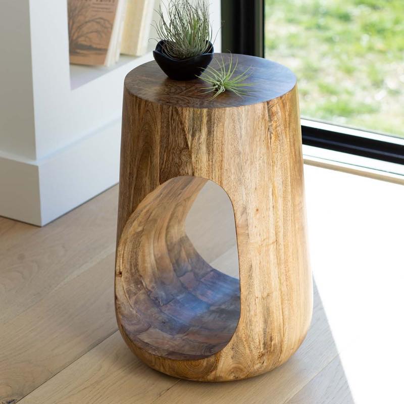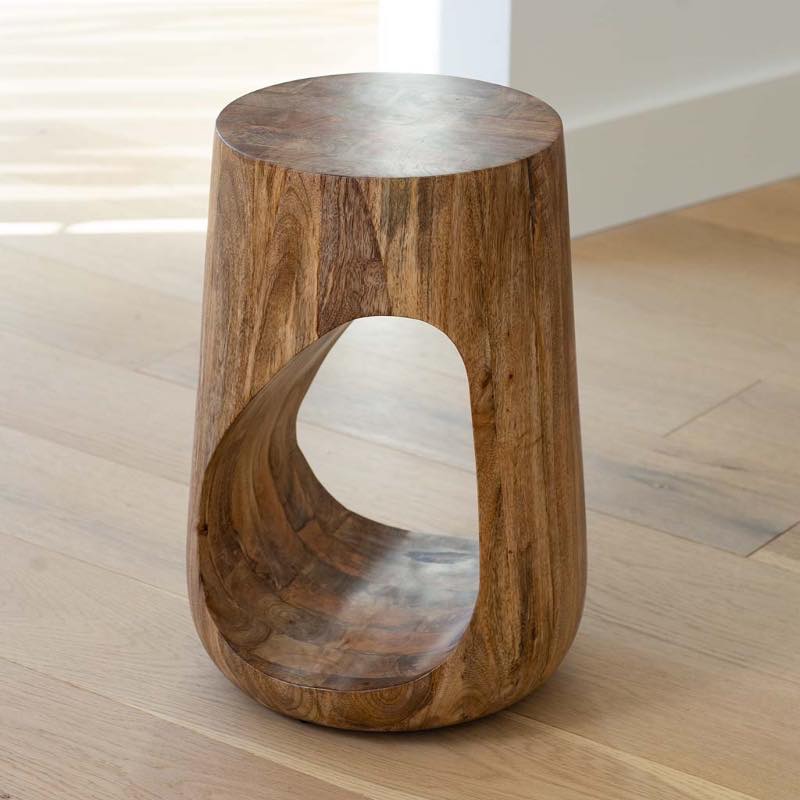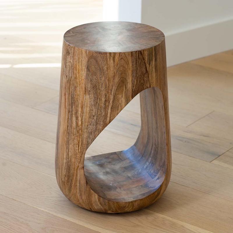 Our unique Askew Cut-Out Accent Table is handcrafted from durable mango wood with an open asymmetrical design and natural finish. The petite size of this pieced-wood stool makes it the perfect drink perch for small spaces. Light-weight enough to move about the room, the sturdy accent table adds elegant utility to your living room, reading nook, or bedroom.