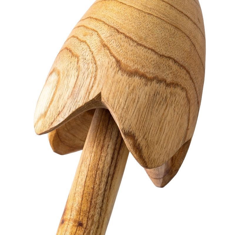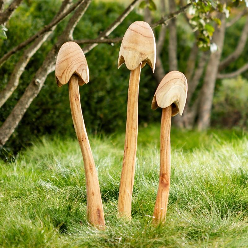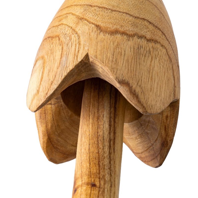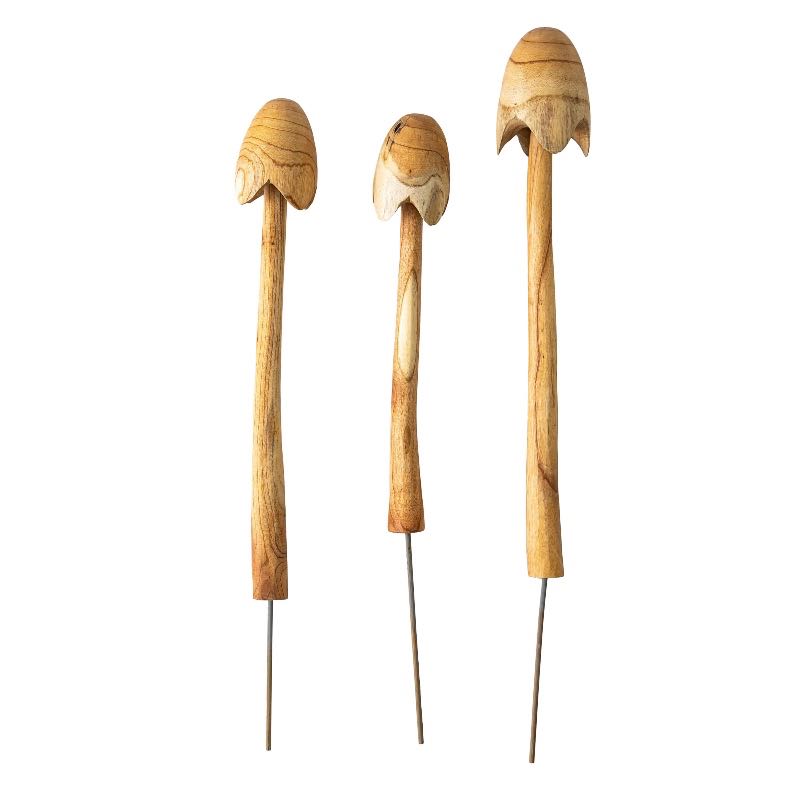 Beautifully hand-carved from Chinaberry wood these Bell Mushroom Garden Stakes are one-of-a-kind garden sculptures that will delight. These larger than life fungi have been crafted with sturdy metal rods to be able to be placed in the ground easily and stand in the outdoor elements. The caps are smoothly rounded and sanded to expose interesting wood grain patterns. Mushrooms may vary in designs dimensions and colors as a result of the characters of natural raw materials.