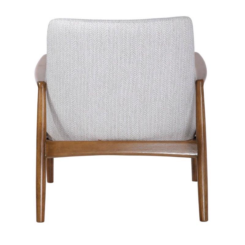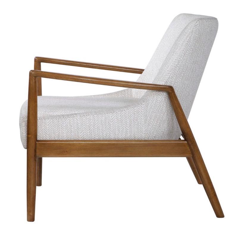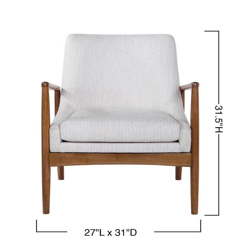 Our Bev Accent Chair inspired by Scandinavian design features an exposed solid wood frame finished in a honey stain and covered in a subtle taupe and white chevron polyester. Its cushy seat is suspended within a minimalist wood frame finished with a honey hue. This armchair will bring eye-catching style and plush comfort to any room in the house.
