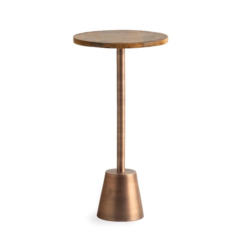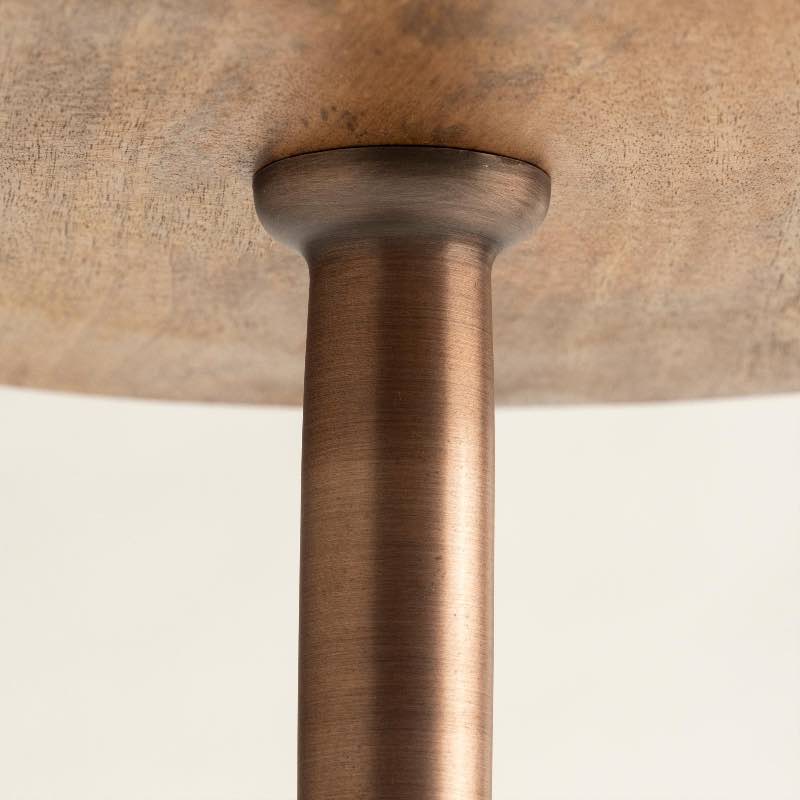 Our drink table features a sleek wood design and burnished copper finish — both sturdy and portable. Experience the perfect blend of elegance and functionality with our Burnished Copper Drink Table. The natural wood top pairs beautifully with the metal base, showcasing a rich copper antique finish that adds sophistication to any space. Each piece is handcrafted by artisans in India, ensuring unique character and exceptional quality.