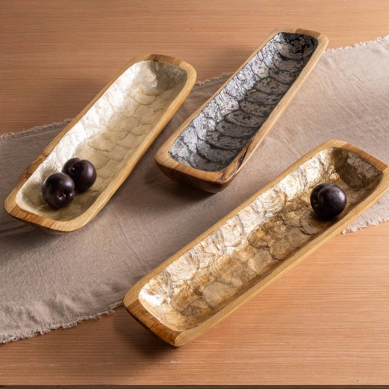 Discover the perfect blend of natural beauty and elegance with our Capiz Shell Long Oval Decorative Bowl. Expertly handcrafted from recycled teak wood and lined with exquisite natural capiz shell pieces, this versatile bowl is ideal for both serving and displaying your cherished items.