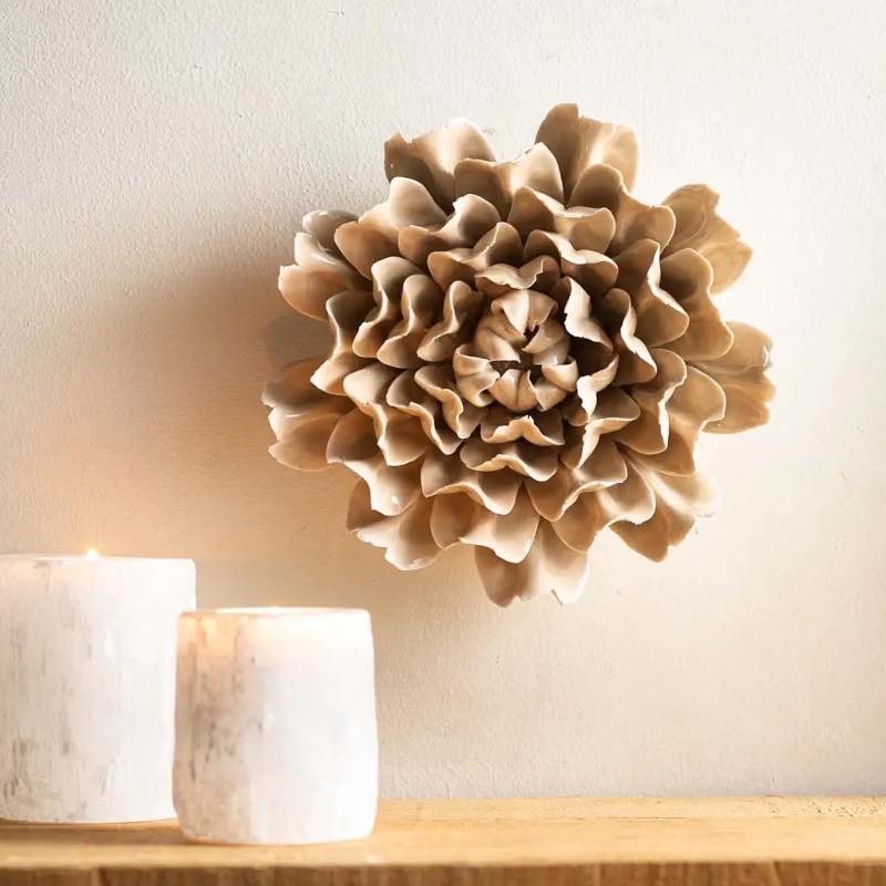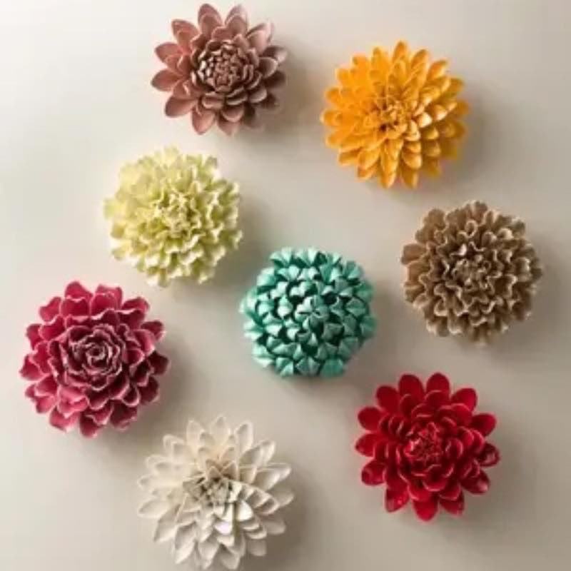 These exquisite handmade ceramic floral objects, inspired by nature, are the perfect summer garnish for dinner tables, shelves, and side tables. Each ceramic flower is carefully hand-sculpted sometimes using 100s of petals to form these bright, cheerful blooms. Back keyhole design allows you to easily hang on any wall or ceiling to create an #insta-worthy, one-of-a-kind art installation.