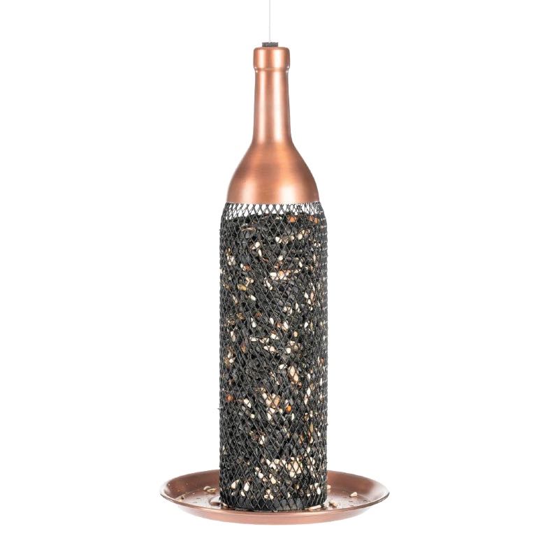Your backyard birds will be ready for happy hour with this Copper-Finished Mesh Wine Bottle Bird Feeder and youll love watching them feast. This unique feeder has been crafted in the shape of a wine bottle with a beautiful and durable copper finish. The middle of the feeder features a mesh rube that allows for multiple birds to dine together....read more