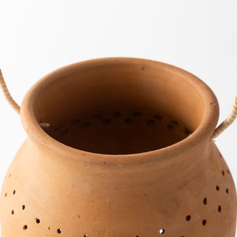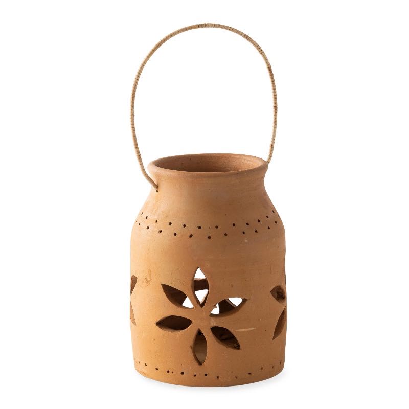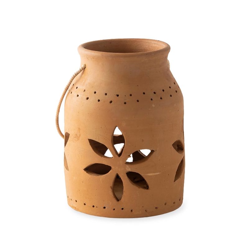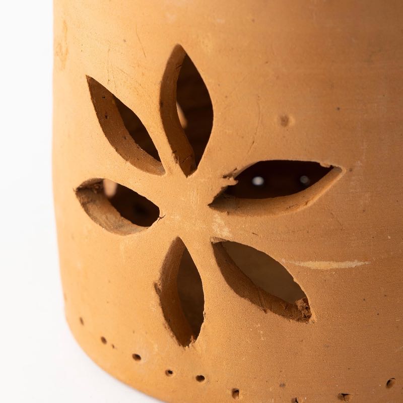 Illuminate your space with the warmth and charm of our Cut-Out Flower Clay Lantern. Crafted from terracotta, this lantern features intricate cut-out patterns, allowing candlelight to shine through in captivating patterns. Designed to hold votives or tealights, it sets your environment aglow with soft ambient light.