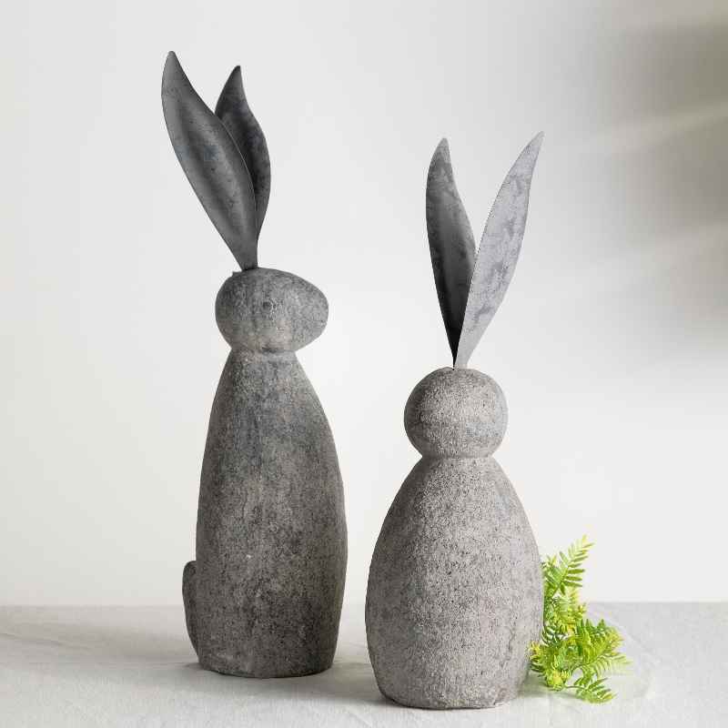 Our short bunny figure lends a fanciful garden-wonderland theme to your seasonal decor. Embodying a modern spirit, you'll want to bring out this minimalist heirloom each and every spring season. He may look heavy, but the faux stone body and metal ears are easy to move around as needed. Use outdoors to greet friends and family or create an impressive tablescape with our 28" tall friend.