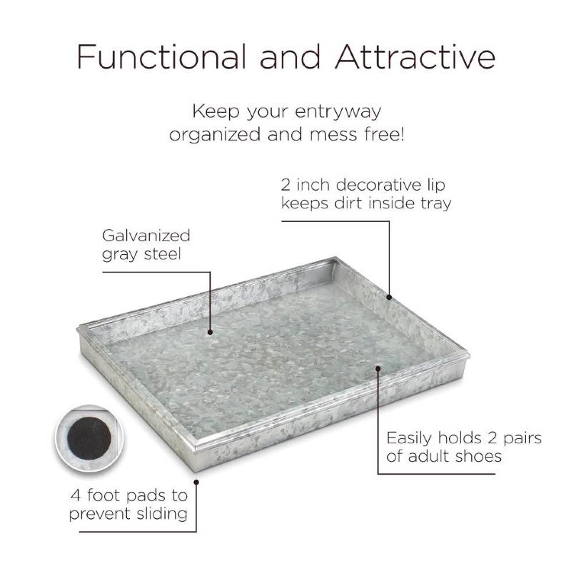 Achieve the highest function while not compromising on style with our Galvanized Steel Classic Boot Tray. Perfect for an entryway mudroom or kitchen our sturdy and attractive boot tray is made from sturdy galvanized steel. Boot tray includes pads on the bottom to prevent sliding. The boot tray is extremely versatile and can be used for shoes potted plants pet...read more