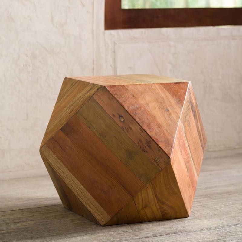 Salvaged wood has been given new life in the sturdy fourteen-faced geometric shapes that prove perfect for a unique side table or extra seating. This modern natural wood block is inspired by the icosahedron shape. Adaptable to a variety of contemporary environments—place it next to a sofa, or freely float it around as needed. Variations in the wood grain add depth and interest.