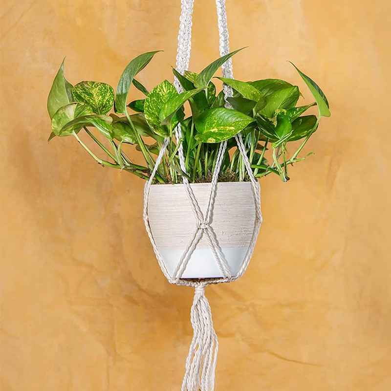 Cascading green flora coupled with a handsewn macramé hanger makes a perfect gift to accent any home. This low-maintenance purifying indoor plant acts as an effective air purifier removing common toxins from the home and is sure to brighten up any space.