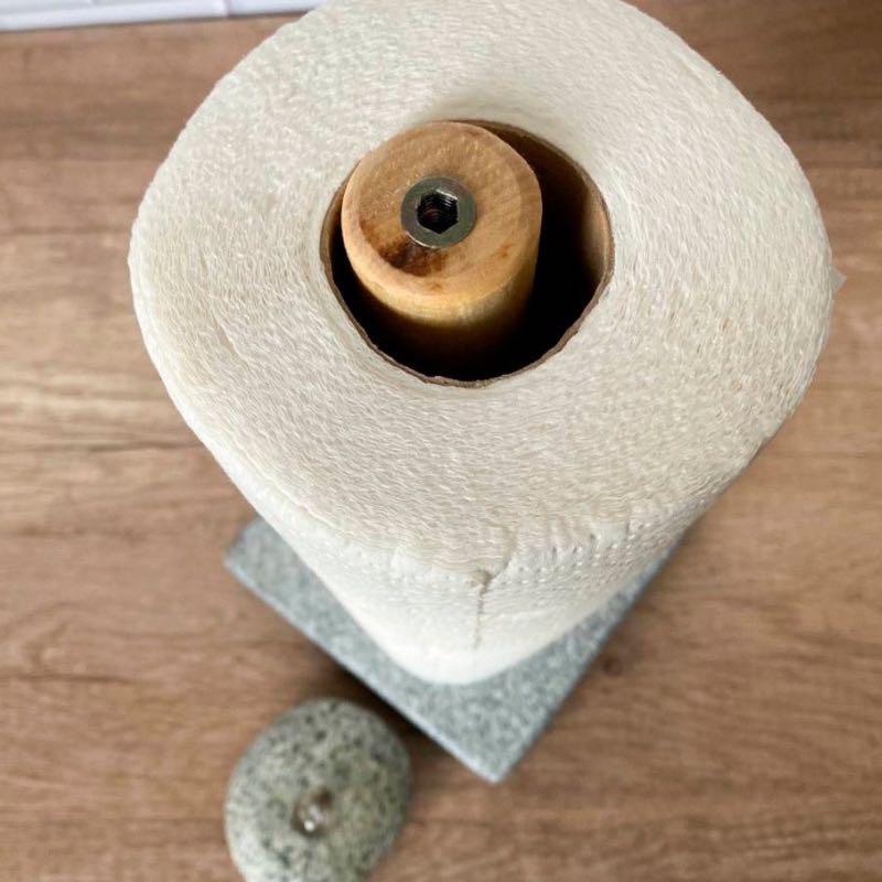 Made with repurposed granite slabs our granite paper towel holder is a classic iteration of a kitchen staple. Accented with a natural beach stone threaded topper to securely hold standard-sized towel rolls. Stones vary in shape size color texture and weight and may or may not have natural mineral deposits. Due to those variations the item pictured is an example only and will not be exactly what is received.
