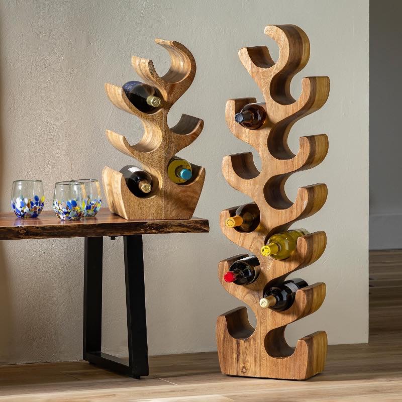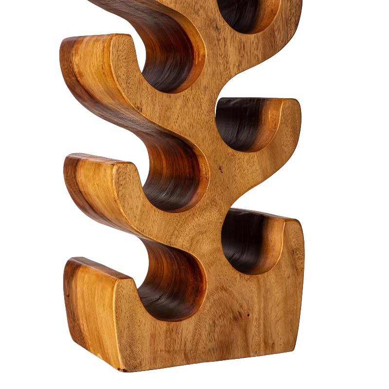 A display of rich organic patterns and textures, the natural finish of the wine rack highlights the beautiful intricate grain of the Suar wood, known for its robustness and unique character. Warm tones and swirls dance gracefully across its surface, making each wine rack truly one-of-a-kind. This piece not only embodies natural beauty, but also brings a touch of rustic elegance into your living space.