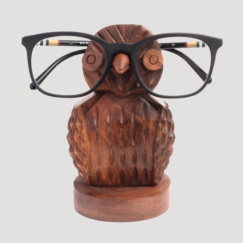 The design thoughtfully incorporates the owls beak as a resting place for the bridge of the glasses while the arms tuck neatly behind the head. Standing gracefully on a wooden platform this eyeglass holder becomes an attractive addition to a desk nightstand side table or any space where youd like to have your glasses within easy reach. This enchanting creation made entirely by hand showcases a commitment to sustainable materials and ethical fair trade practices.