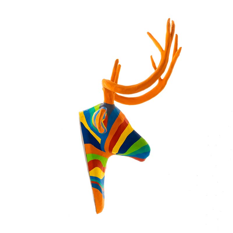 Haitian artisans known for their creativity and craftsmanship have skillfully brought this majestic deer to life using the traditional paper mache technique. The Rainbow option with vibrant and eye-catching colors is skillfully applied further enhancing the deers presence. The use of bright tones adds a touch of Haitian flair to the artwork making it a beautiful and lively addition to any space. The black-and-white newsprint option is perfect when you need a modern touch and want an unexpected pop of art in your space.