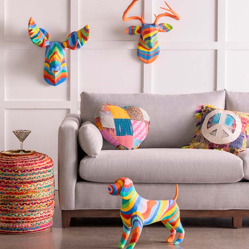 A guaranteed conversation starter these large-scale faux animal heads are handcrafted by an artist collective in Haiti. Made from recycled materials and natural cassava starch glue each is a one-of-a-kind piece of art.
