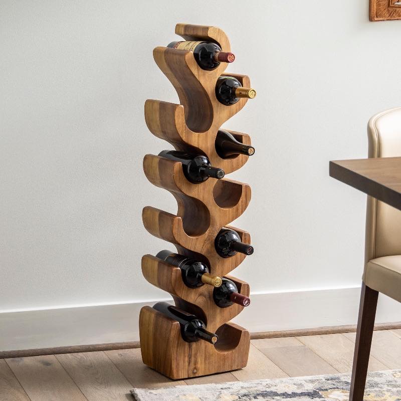 This beautiful and unique solid wood wine rack stand is hand carved from 1-piece of mango wood by artisans in India. The natural finish enhances the beautiful wood grain, adding warm tones to this functional sculpture.