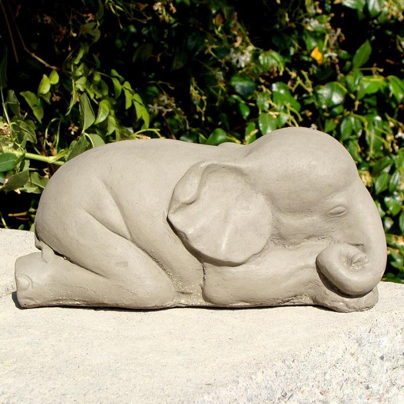 • Hand cast in sold weather-resistant concrete, this slumbering baby elephant garden statue can stay outside all season long