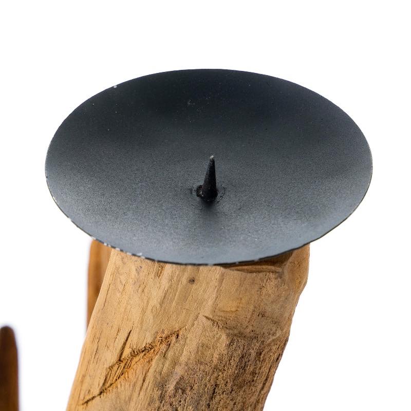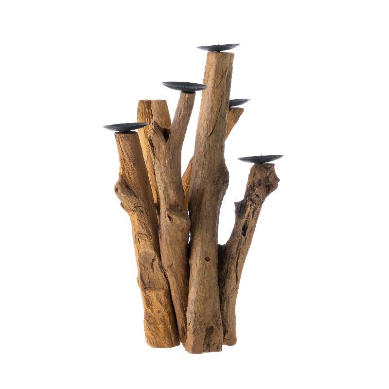 The warm rich color of teak wood adds a touch of sophistication to the candelabra making it an eye-catching centerpiece or accent piece in any room. Whether used as a focal point on a dining table sideboard or fireplace accent the Teak Branch Candelabra brings a sense of natural beauty and elegance to the space.