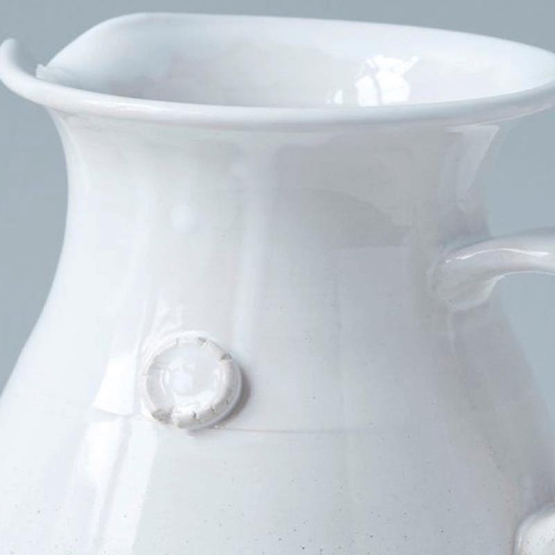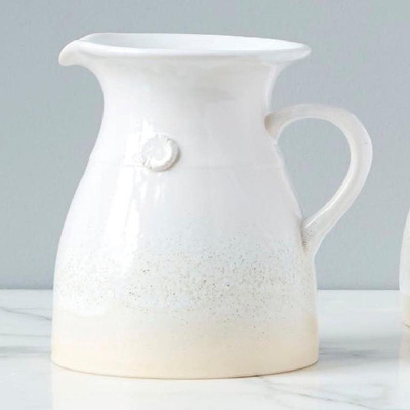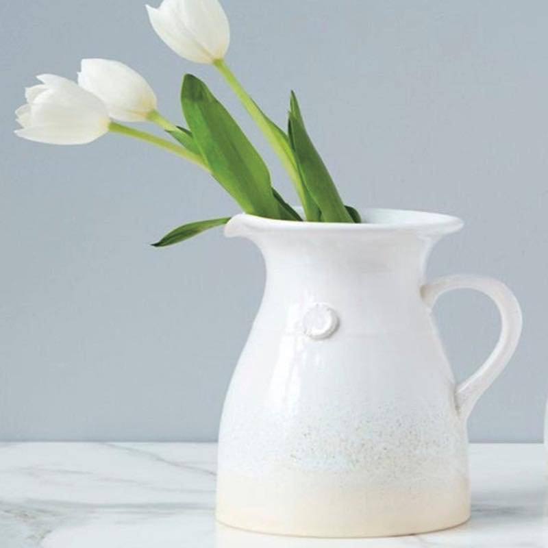 Handcrafted from white clay this Handthrown Water Pitcher is created by European artisans on an original potters wheel. The pieces are inspired by classic European kitchens mixing traditional designs with contemporary style. While each item is different and will vary due to the handcrafted technique used to create them each piece boasts a unique lush glaze to enhance authenticity. The raw clay is left untouched on the bottom while the top portion is dipped in a warm white lead-free non-toxic glaze for the perfect mix of traditional design and contemporary style.