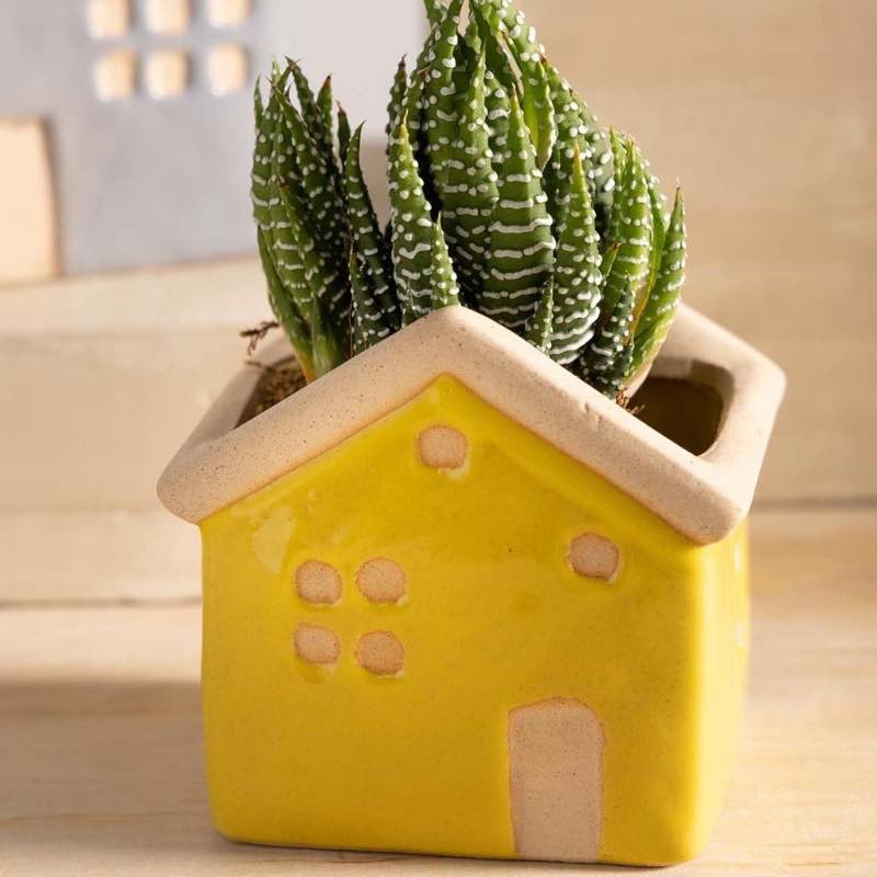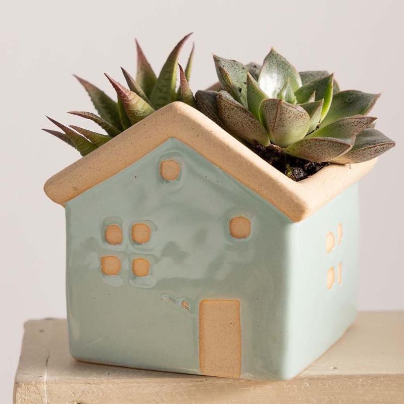 Bring the charm of home anywhere with a petite gathering of succulents. Two succulents in the small houses and three in the large house create a colorful community that grows in an easy-to-care-for habitat. With varied plump leaves stems or roots succulents form a vast and diverse group of plants offering easy-care choices for your home.