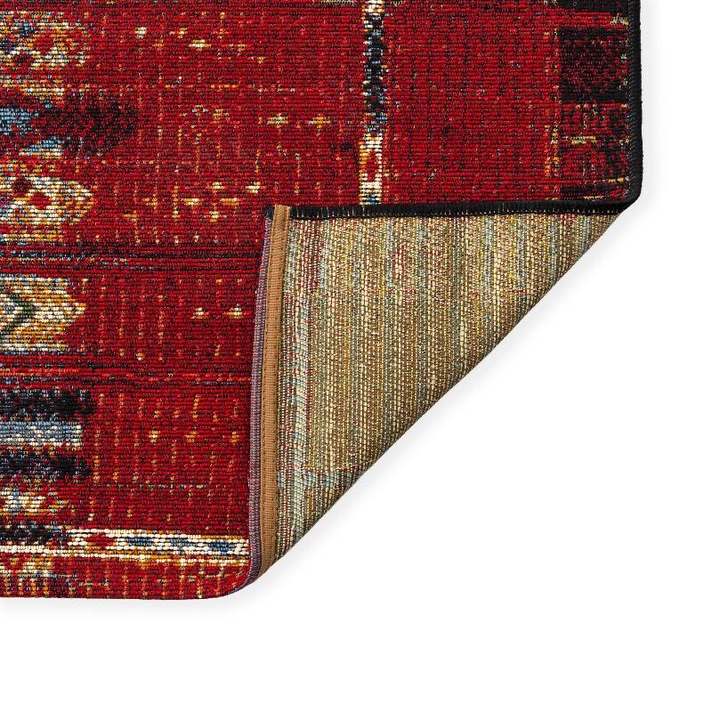 • Rich Color Palette: Deep, warm red base interwoven with vibrant blues, greens, yellows, and whites