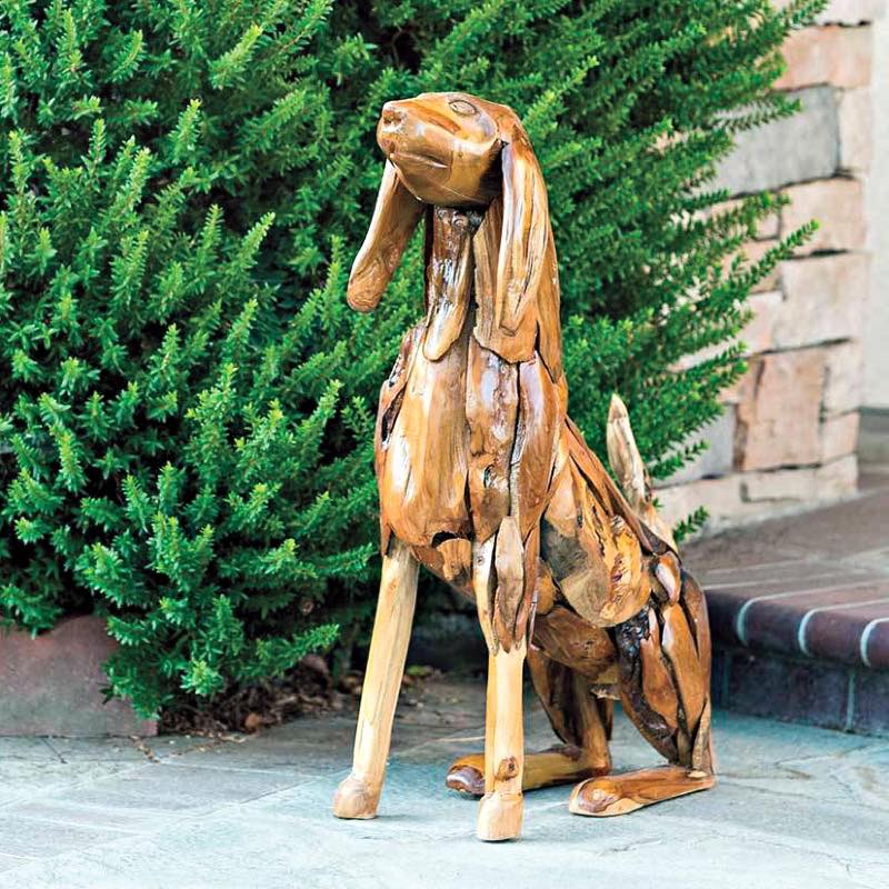 Loveably unique our pieced driftwood-style teak dog has mastered the commands sit and stay! Artistically shaped with pieces of natural teak this handcrafted art invites a sense of calm and beauty. With its own distinctive character this masterful sculpture sits a stately 31" tall and adds a regal welcome to your front porch or patio.