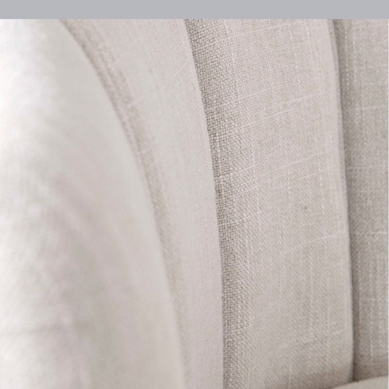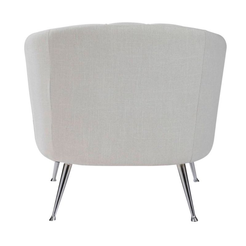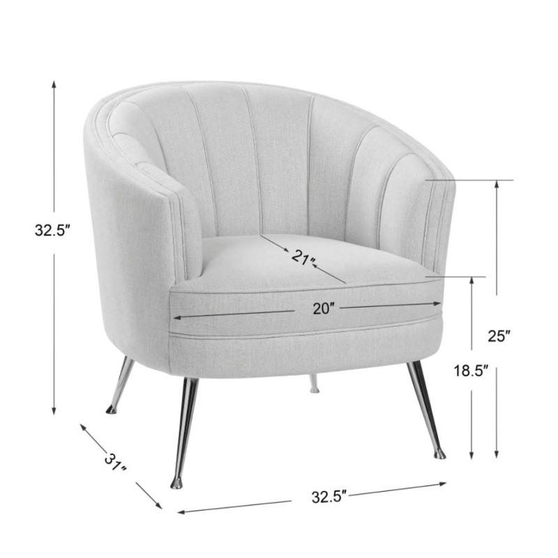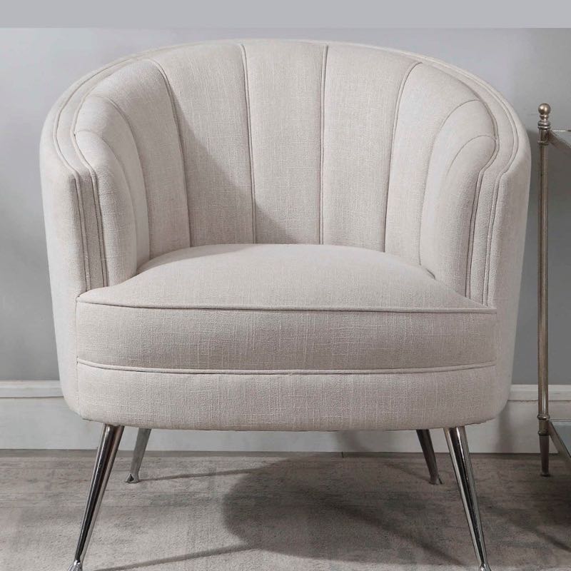 The perfect balance of retro and modern style this welt-trimmed barrel back chair is covered in a casual light tan fabric with channel tufting and polished nickel tapered legs. Create an attractive spot to unwind in the living room or bedroom with this luxe seat. Seat height is 19.