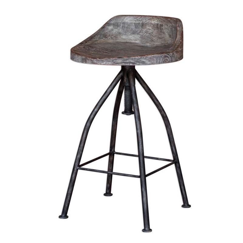 Go for an exotic look with this sleek industrial adjustable bar stool. Its hand-carved bowl seat is fashioned from a mixture of softwoods and treated to a gray glazed driftwood finish. An industrial swivel screw adds ambiance and function. Blackened zinc-iron serves as a tasteful base material. Add this industrial adjustable bar stool to a fashionable ensemble in your dining or entertaining area.