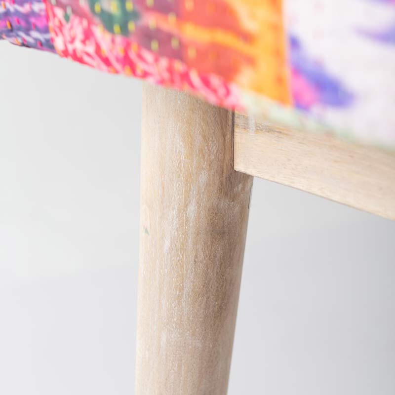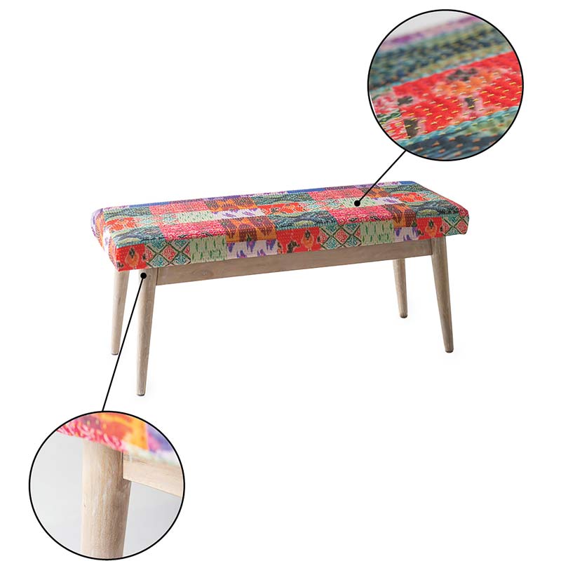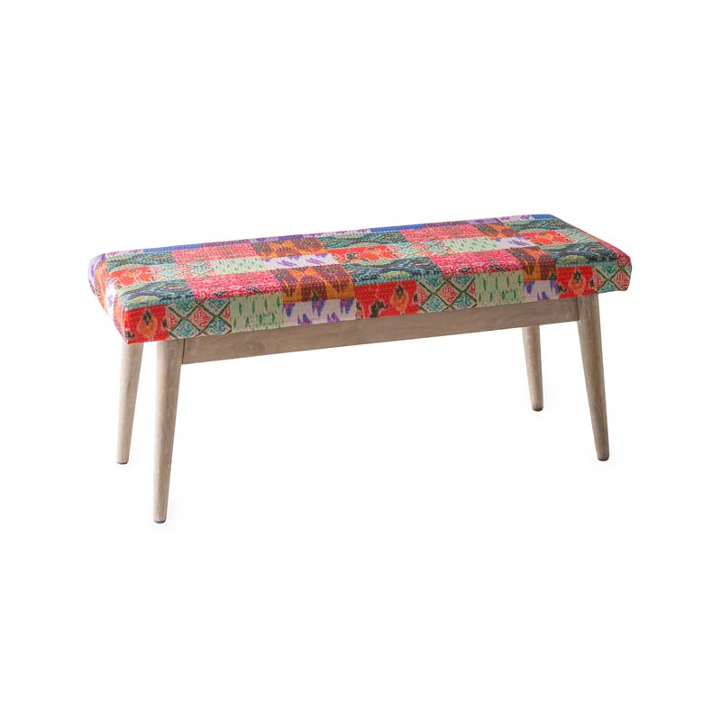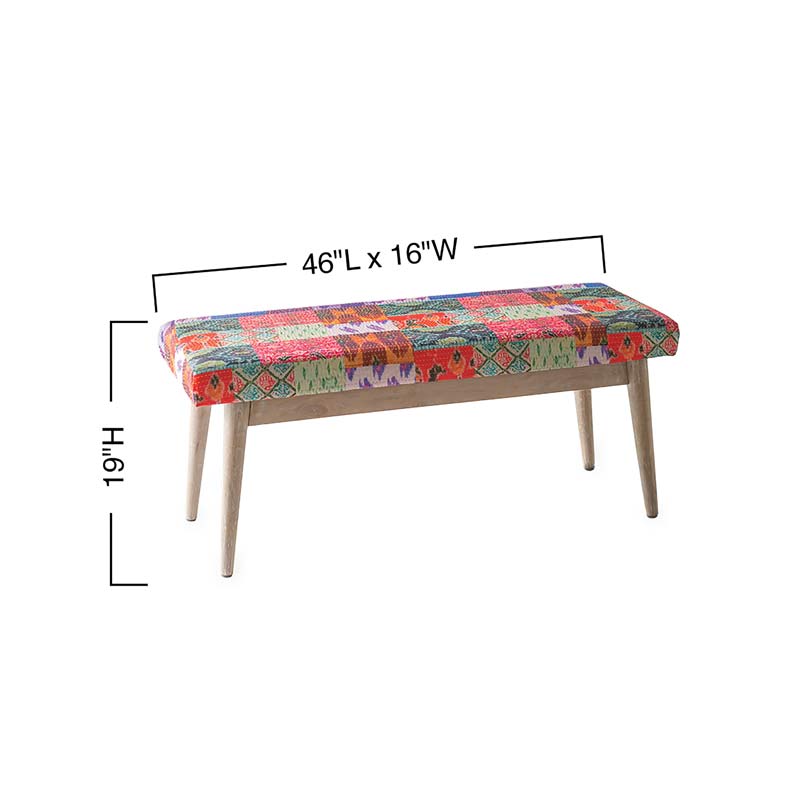 This bench, upholstered with Sari-style printed fabric and colorful Kantha hand stitching, stands out in an entry or at the foot of the bed. The light gray Indica wood tapered legs add a modern touch. Foam cushion, imported.