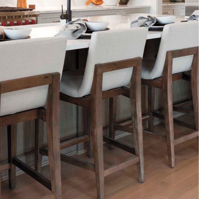 Beautifully built and supremely comfortable our Klemens Upholstered Bar Stool plays on mid-century style with modern walnut-toned wood finishes. The bar and counter stools curved backrests and subtly tapered legs lend a sense of airy elegance. A gently sloped padded seat in a neutral linen blend performance fabric rests within a solid birch wood frame with a brushed nickel metal...read more