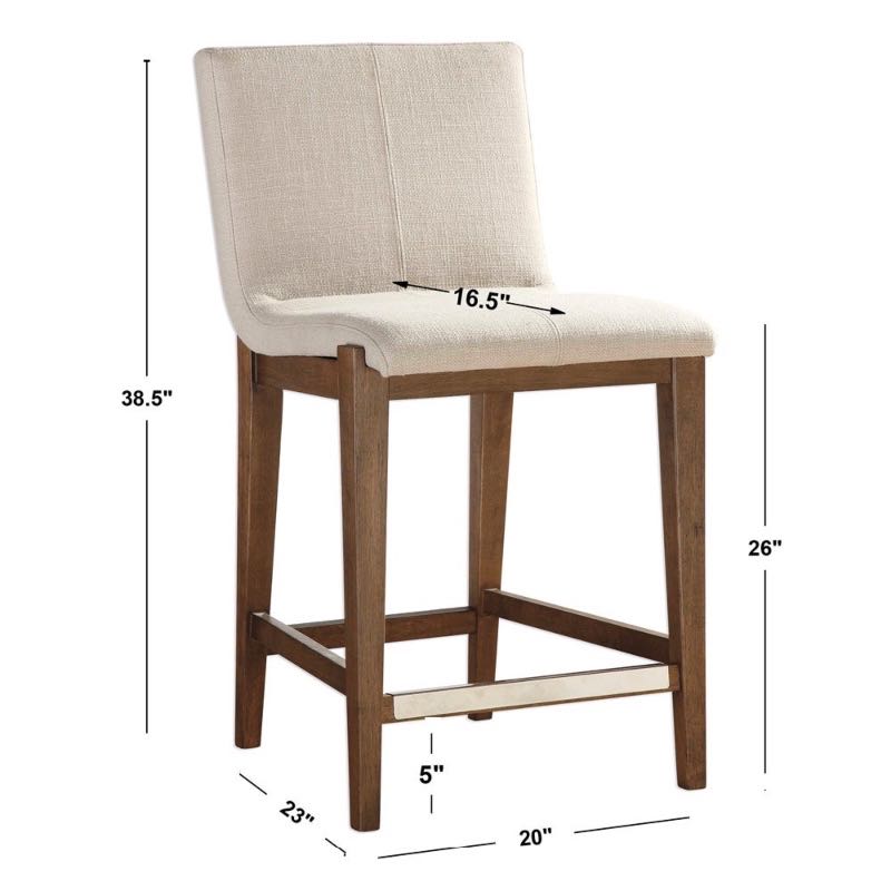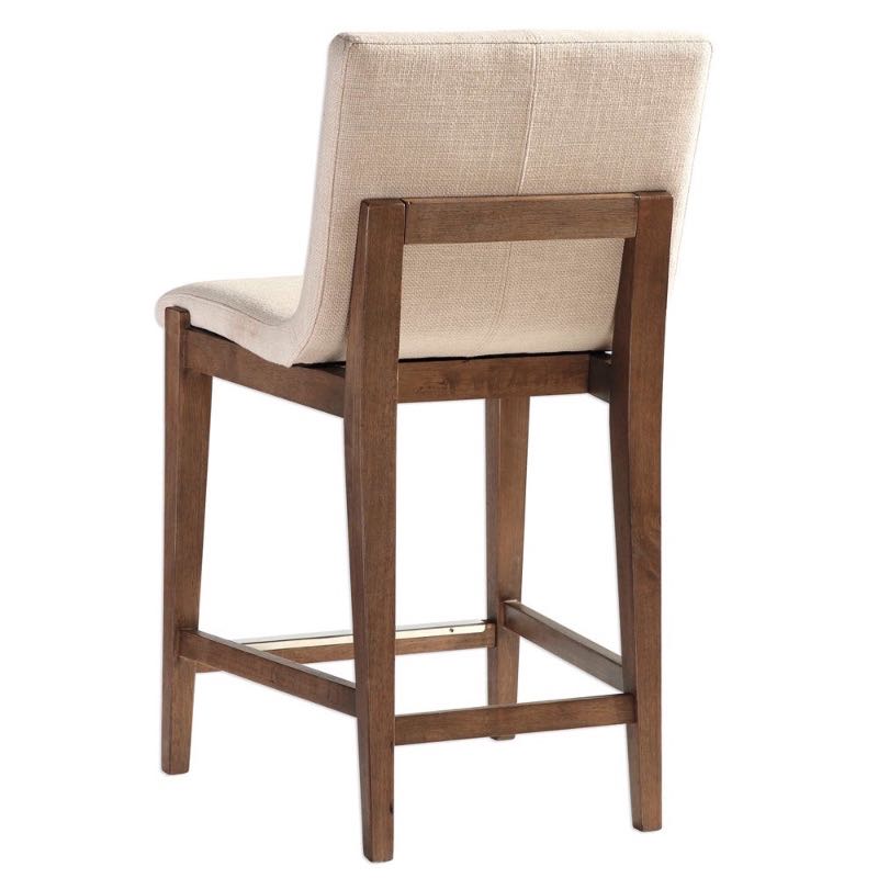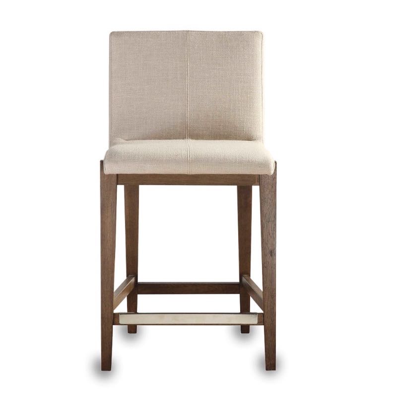 Beautifully built and supremely comfortable our Klemens Upholstered Bar Stool plays on mid-century style with modern walnut-toned wood finishes. The bar and counter stools curved backrests and subtly tapered legs lend a sense of airy elegance. A gently sloped padded seat in a neutral linen blend performance fabric rests within a solid birch wood frame with a brushed nickel metal kick plate. The seat height is 26.