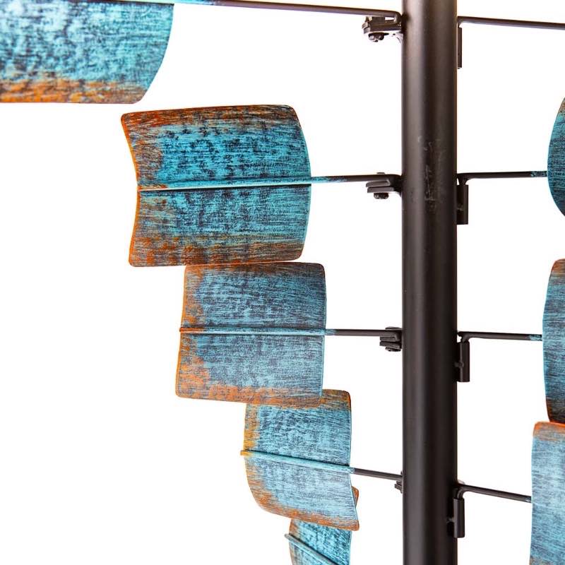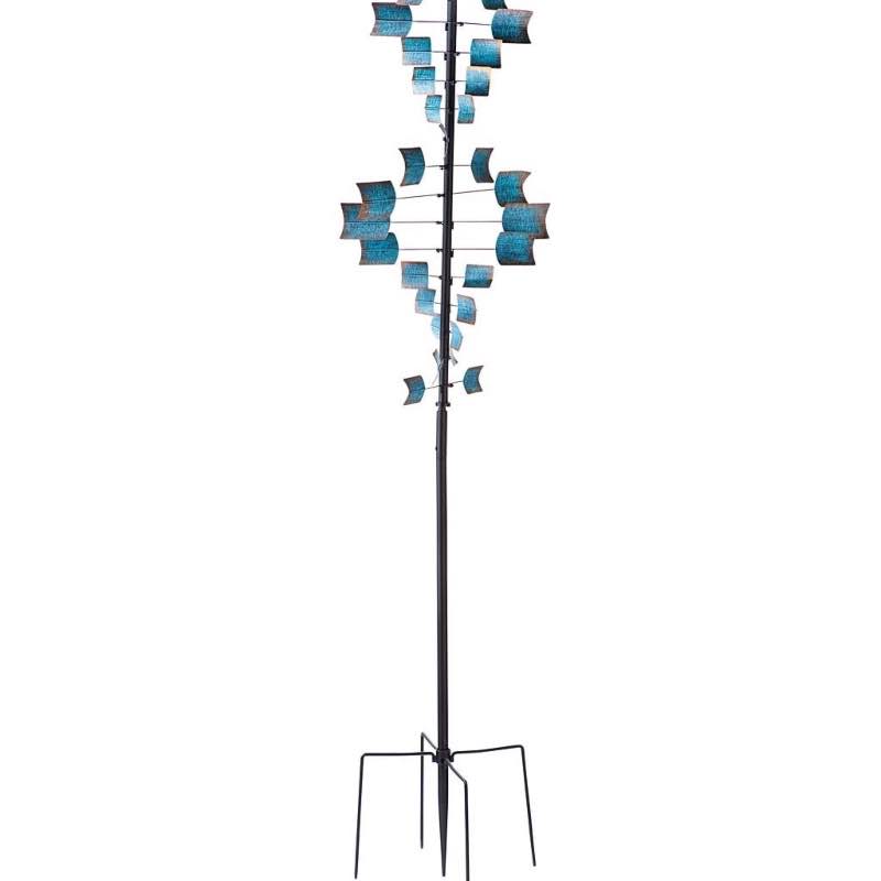 At more than nine feet tall this Metal Wind Spinner will be a true statement piece in your landscape. The 15 connected arms form a spiral that spreads out to more than 30 inches in diameter and twirls in even a gentle breeze. At both ends of each arm a blue and copper-colored vane catches the wind to send the whole thing twirling.