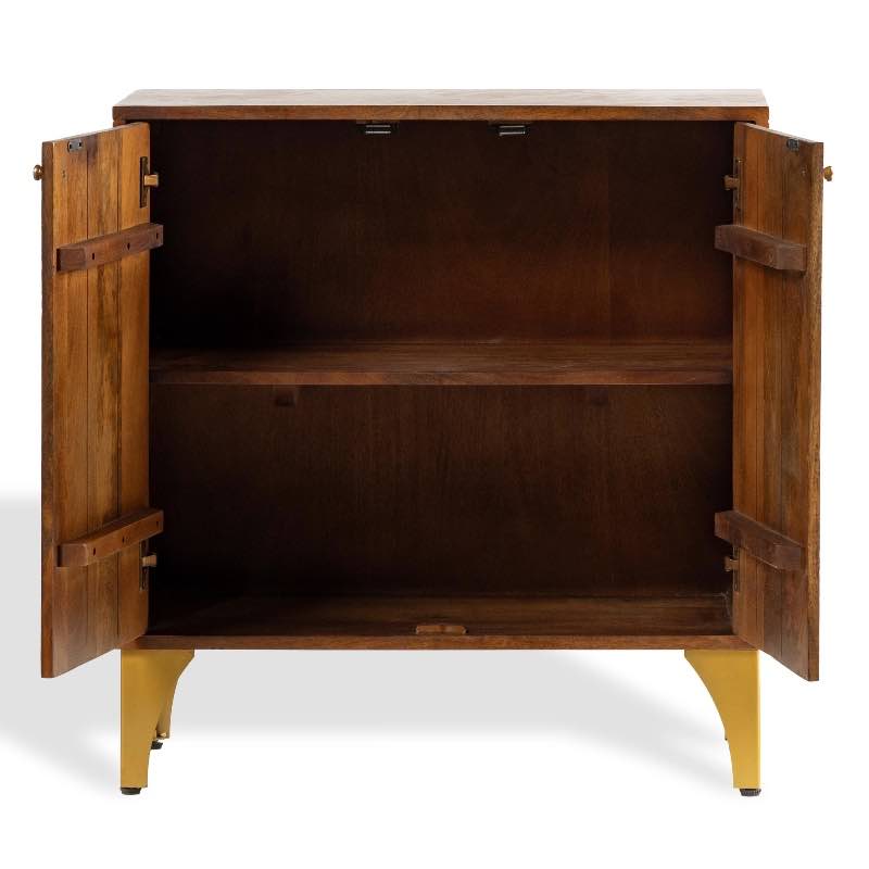 Inside, you'll find two spacious shelves, each 12 inches apart, providing ample storage for your essentials. The cabinet stands on gold finish legs, adding elegance to any room.