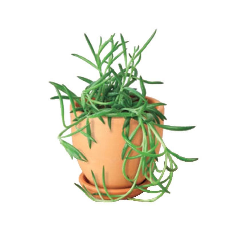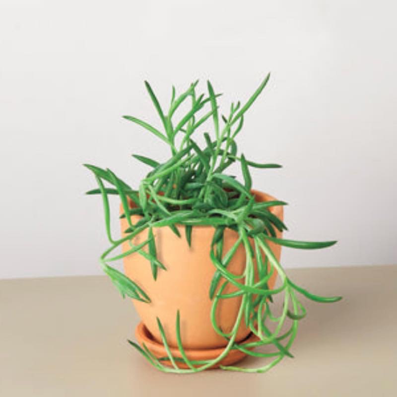 Senecio Fish Hooks (Senecio radicans) is a flowering succulent plant native to South Africa. It is a hardy and easy-to-care-for houseplant with plump blue-hued banana-shaped leaves that grow in a trailing nature. It sprouts white small cinnamon-scented flowers once a year even when kept indoors. Often grown in hanging baskets the leaves sprout along trailing vines that hang straight down in a bead-like formation. Best placed on a windowsill or shelf these plants will grow quickly and can reach upwards of 10ft in length.