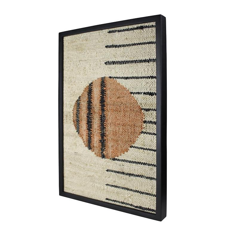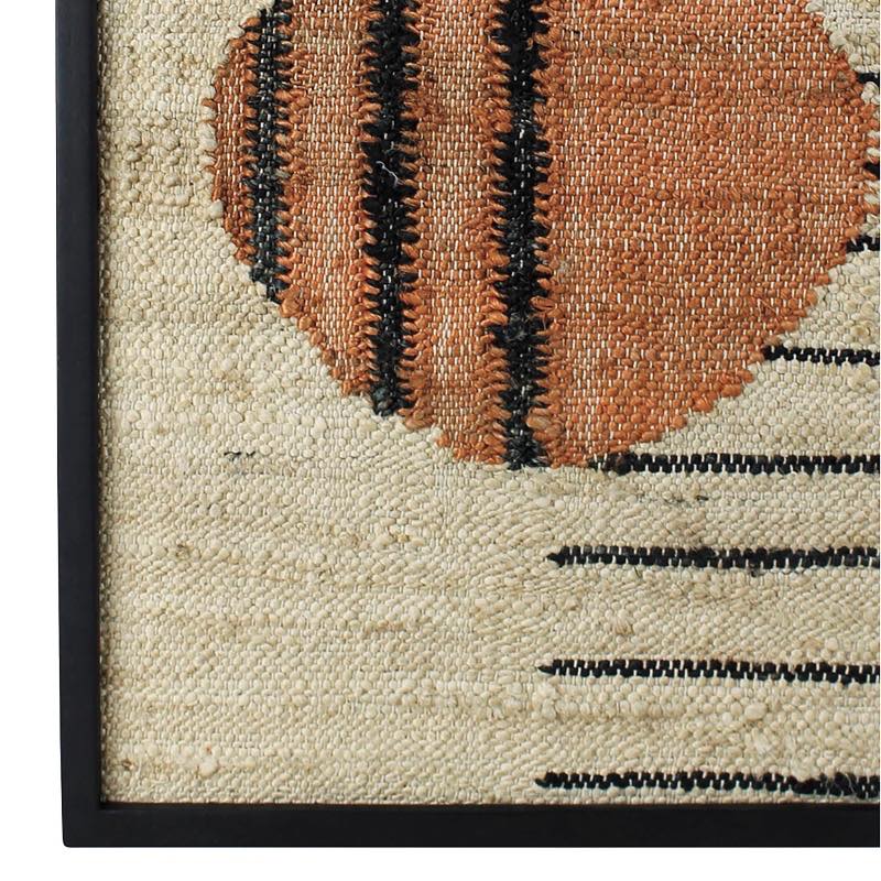 Cotton and hemp are kilim loomed into graphic patterns and framed in mango wood with a deep black stain. It is impressive hung on its own but creates a statement-worthy design when displayed as a trio with the two other pieces from the collection. Each piece is hand-loomed so beautiful variations are to be embraced.