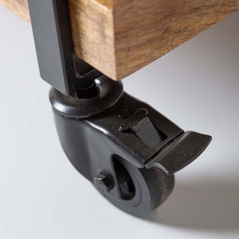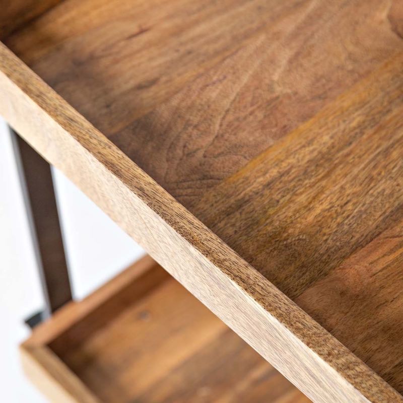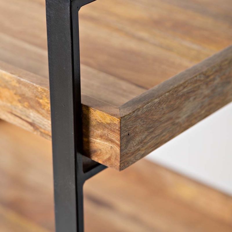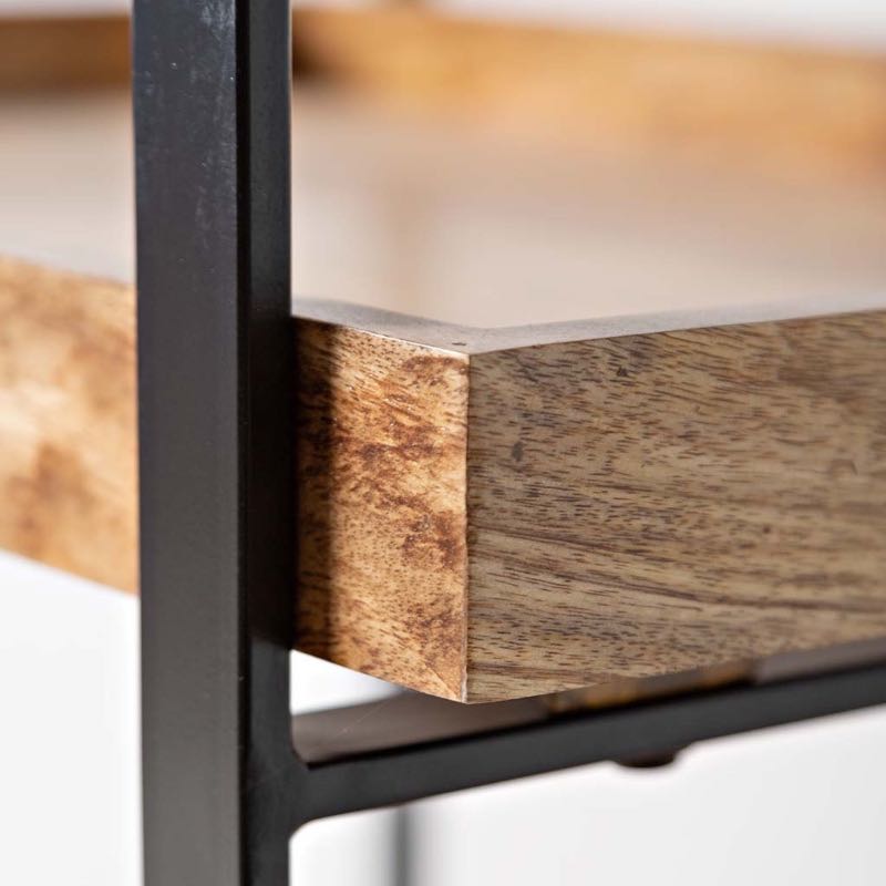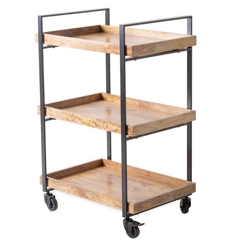 • Combining black metal construction and natural mango wood trays for a contemporary look