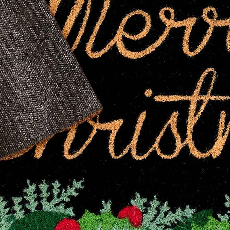 Our Merry Christmas Holly mat is joyful yet sophisticated adding a pop of color to your entryway. This coir utility mat is both stylish and practical in black. Natura coir doormats are durable and beautiful. Crafted from 100% coir which is an all-natural material known for its strength. Coir is eco-friendly made from natural fibers which are extracted from the outer shell of a coconut known for its strength and durability. Natura coir mats feature a durable vinyl back and a stiff durable natural coir front perfect for wiping shoes before entering the home keeping it tidy. Dyes saturate the fibers for long-lasting color.