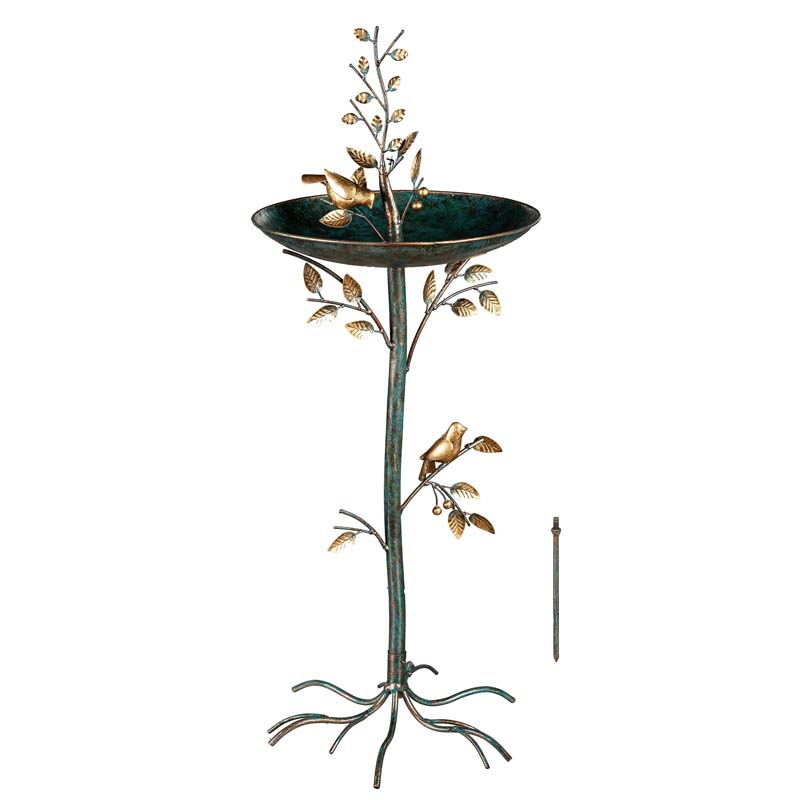 ...read moreHandcrafted from reclaimed oil drums, this recycled metal birdbath features a beautifully detailed tree with foliage and songbirds. Golden highlights enhance its bronze finish, and its 360° design looks stunning from every angle. A sustainable, artistic accent for your patio, porch, or garden that invites nature to your space.