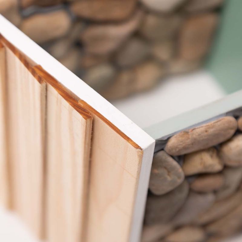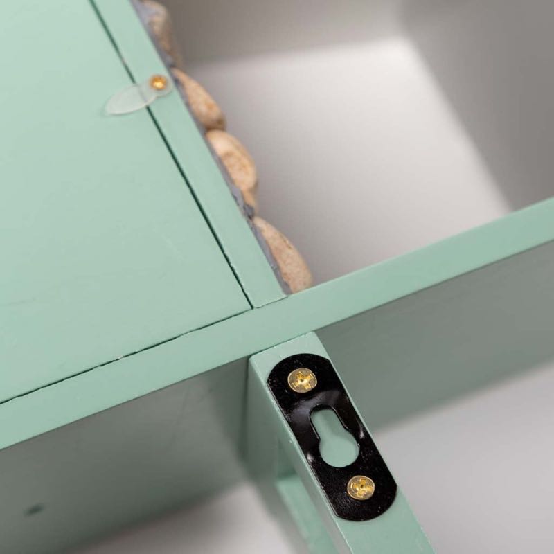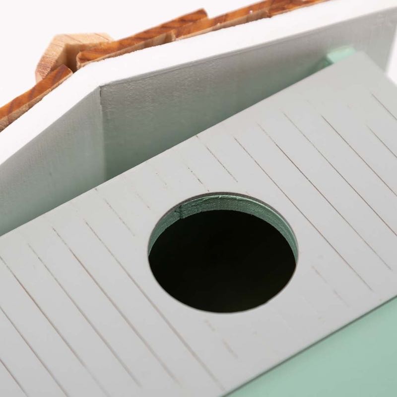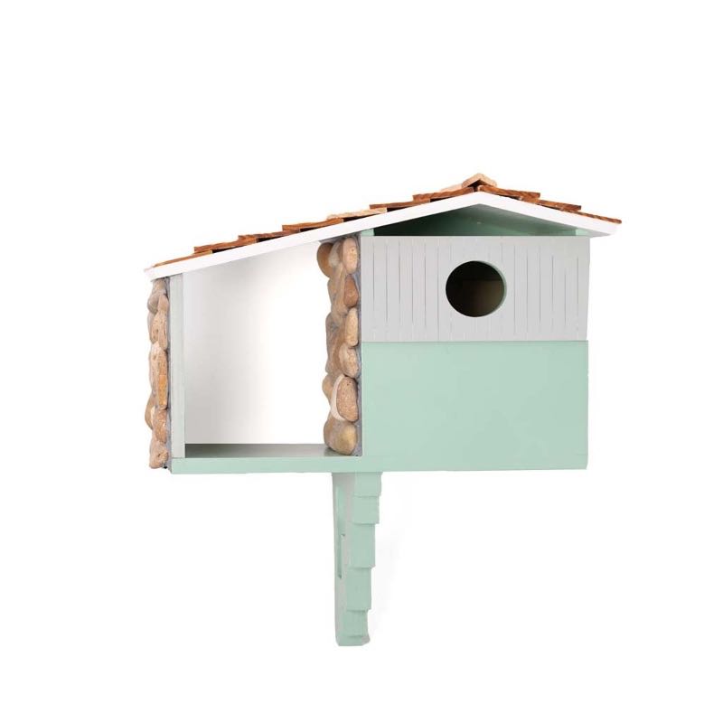 This retro bird cottage features a pine-shingled roof and a sturdy stone facade. In keeping with mid-century modern design, this birdhouse features an open plan, large windows, and minimalistic decor. The opening can accommodate most small nesting birds and has all the qualities for a bird enthusiast, including accessible cleanout, drainage, and ventilation.