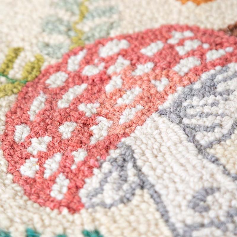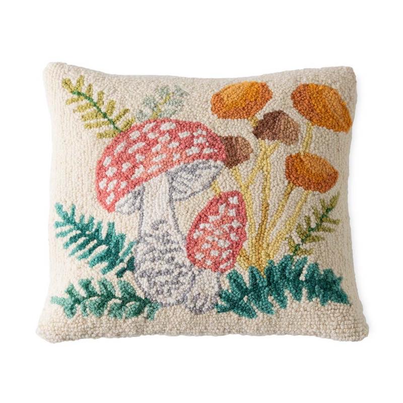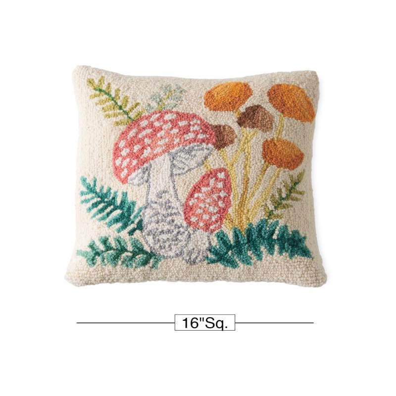 This whimsical throw pillow is hand-hooked with mushrooms in a warm autumnal palette. Shades of gold green brown and orange on an ivory background will fit perfectly in any home decor from farmhouse to bohemian.