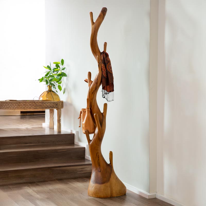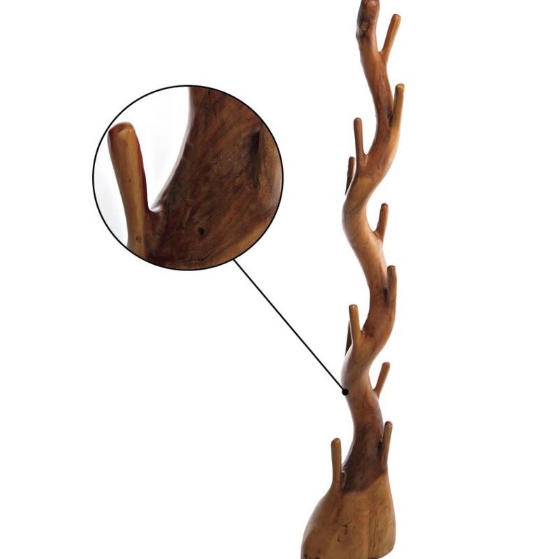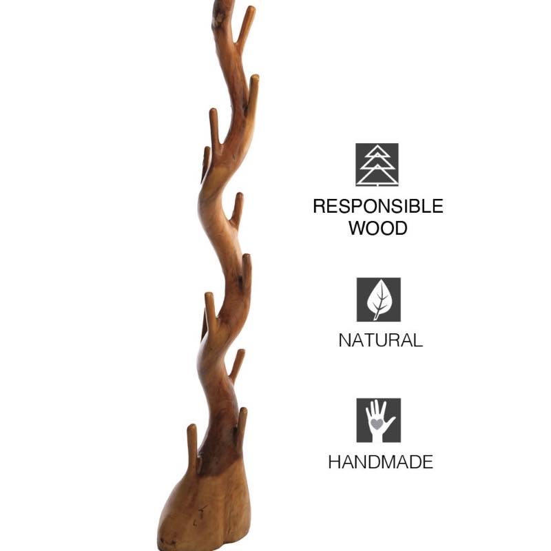 Artisans in Indonesia hand-carve a single suar wood log into a gently twisted coat rack for a one-of-a-kind, space-saving stand, branching out to hold your entryway essentials. Constructed of solid suar wood that beautifully highlights the natural grain of the wood, this coat rack features a smooth natural finish and organic design. Approximately 10 hooks provide a convenient place to hang coats, sweaters, hats, and scarves to keep your entryway clear and clutter-free. Get the most out of your entryway with a graceful coat tree that stands on its own as a conversation-worthy sculptural accent piece.