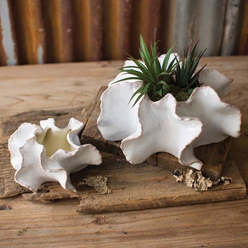 These Organic Ceramic Planters take on a beach inspired design reminiscent of a shell found in the ocean. Their creamy tone and weathered patina creates a neutral planter that can be set against most decorative styles. We especially love them as candle holders.